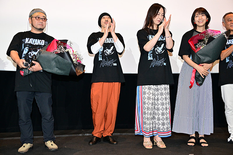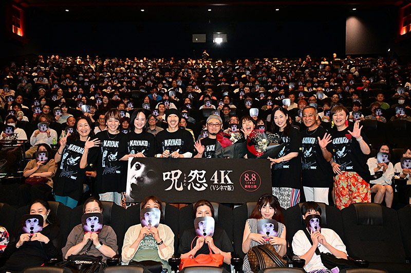 8月8日の劇場公開目前に控えた7月27日(日) “呪!25周年トシオくん生誕祭!”と銘打った『呪怨〈4K:Vシネマ版〉』舞台挨拶付上映会が新宿バルト9で実施されました。 正式公開前となるこの日は、劇中登場する「呪怨」シリーズの顔ともいえるトシオ君の誕生日。〈Vシネマ版:4K〉ではこの誕生日をはっきりと確認することが出来たことを記念したイベントだが、この日は清水監督の誕生日。また、すべてを呪うホラークイーンとして登場する佐伯伽椰子役を、続く劇場版やハリウッド版など計六作品で演じている、藤貴子さんの誕生日でもあることも判明! この奇妙な因縁を呪う(祝う?)べく、柳憂怜(小林俊介役)、大家由祐子(鈴木響子役)、三輪ひとみ(由紀役)、三輪明日美(村上柑菜役)、松山鷹志(佐伯剛雄役)、吉行由実(村上典子役) 、藤井かほり(北田良美役)らキャスト陣も登壇! 伝説的恐怖Vシネ『呪怨』第1作目の上映後、恐怖の余韻に包まれた満員御礼の会場に集結したキャスト&監督陣だったが、ステージ上はもはや25年ぶりの同窓会状態。 まずは第1作目に出演した柳憂怜(小林俊介役)、三輪ひとみ(由紀役)、三輪明日美(村上柑菜役)、吉行由実(村上典子役)、清水崇監督がラインナップ。制作から25年を経て4Kでの劇場公開に明日美が「スゴイ!としか言いようがない」と興奮すれば、柳も「25年って凄いよ。自分は今62歳だけれど、25年前当時62歳だった人は今生きていない。それだけ相当に凄いということ」と変な例えでしみじみし、すかさず清水監督から「生きてるだろ!江戸時代の話かよ!」とツッコまれていた。 劇中のCGについては、三輪明日美が「25年ぶりに観るとCGがチープ…」と指摘すると、清水監督は「予算がなくてCG専門ではない人が作っていますからね」と当時の懐事情を暴露。そんなCG合成が必要な場面の撮影時の話題になると、三輪明日美が「私の顎がないというシーンの撮影では、監督から『動くな』と言われて動かないようにしたいのに、体が勝手に揺れ動いた」などと回想。その撮影現場にいた三輪ひとみ曰く、「(明日美が)『家が呪われている!』とか言ってグワングワンと上半身を動かしていた」そうで、当の三輪明日美は「動きが止まらず汗も出て来るし、監督からは『なぜ止まれないんだ!?』と怒られるし。結局2人がかりで体を押さえてもらって撮影していただきました」と怪奇な状態に陥っていた事実を打ち明けた。 またこの日の登壇直前まで観客と共に本編を観ていたという吉行からは、背筋がゾッとするエピソードも飛び出した。「映画を観ていたら後ろの方から俊雄が走り回るような足音が聞こえて。そんな効果音ないはずなのに…。映画の上映中に場内をバタバタと走る人なんていないのに。今リアルにビビっています」と戦々恐々。これに清水監督は「はい、この後に病院に行ってください」とクールに返し、場内爆笑となりました。 あらためて柳は、『呪怨』への思い入れについて「『呪怨』がなかったら僕は今ここに間違いなくいない。『呪怨』のお陰で俳優業を続けられている」としんみり。吉行も「これまで3回くらい外国の方に『呪怨』に出てますよね?と声をかけられた」と言えば、三輪ひとみも「私もいまだに言われる」と代表作だと述べました。清水監督は「9日間で2本分を撮らなければならず、現場はぐちゃぐちゃでした。それが25年後にまさかこんなことになるとは、思ってもいなかった。俳優の皆さんもよく理解して出演してくれたものだと思います」と感謝していた。 『呪怨2』からは、藤貴子(佐伯伽椰子役)、大家由祐子(鈴木響子役)、松山鷹志(佐伯剛雄役)、藤井かほり(北田良美役)、清水監督がトークに参加した。 『呪怨2』出演後の反響について松山は「最近は声の仕事をやらせてもらっていますが、声優さんやスタッフさんにホラーファンの人が多くて、剛雄を演じていたからという理由で呼ばれたこともあるし、藤さんと『呪怨』の夫婦という理由から、セットで呼んでもらうこともある」と『呪怨』需要を明かしていた。 藤井は当時の撮影現場の様子について「笑いが絶えなくて楽しい現場でした。若かった清水監督をいじったり、その後も皆さんとは仲が良くて定期的に会ったりしていました。映画の怖いイメージとは真逆でした」と回想。制作当時特別上映されていたBOX東中野で清水監督と『呪怨』のレイトショー上映を観に行ったという大家は「監督が携帯をマナーモードにしていなくて、上映前に『あああ…』というトシオくんの声が着信音として鳴り響いて。ウソでしょ?バカじゃないの?と思った」とぶっちゃけて場内爆笑となりました。 劇中トシオくんの「あああ…」という声は、実は清水監督自身の声によるものだという。松山は「あああ…は現場でオーディションをやりました。最終的に清水監督の声が採用されて俺たちは落ちた」と思い出し笑い。清水監督は「ベースは俺の声ですが、皆さんの声も混ぜ合わせています。ちなみに『あああ…』は