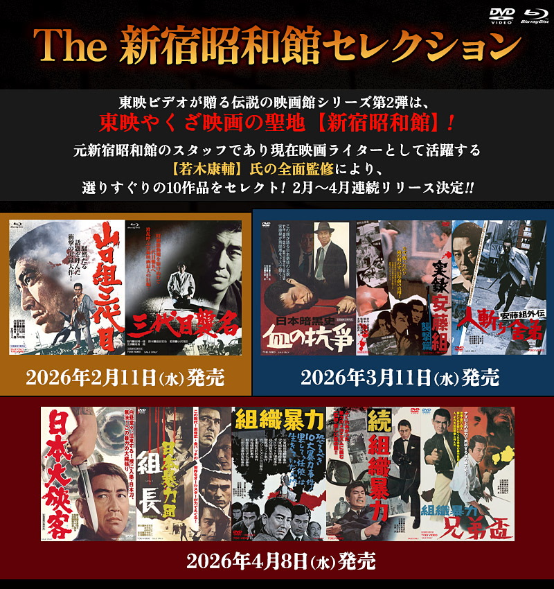 東映ビデオが贈る伝説の映画館シリーズ第2弾!【大井武蔵野館】に続いての登場は、東映やくざ映画の聖地【新宿昭和館】だ! かつて新宿3丁目にあった旧作上映の映画館、【新宿昭和館】。もともと封切館として戦前来の歴史を持つが、1960年代に名画座になって以来、毎週3本立て自由席かけ流し(途中の出入り自由)を基本に、【東映やくざ映画】中心の番組を頑固なほどに続けた。平成の世になると【やくざ映画の聖地】と一目置かれるようになったが、2002年の春に惜しまれつつ閉館…… しかしながら、この劇場の在りし日の姿を描いた『名画座番外地』(川原テツ著)が第5回幻冬舎アウトロー大賞を受賞すると、現代ではあり得ないとんでもなくアナーキーな姿に魅了され、若い世代に「遅れて来た昭和館ファン」が急増!今や新宿昭和館はサブカルチャーの一大拠点【伝説の映画館】と化している。 そこで東映ビデオは、【The新宿昭和館セレクション】と銘打って、「今もし新宿昭和館が復活したら、どのような東映映画を上映するだろうか」をコンセプトとした一大リリース企画の打ち出しを決定!元新宿昭和館のスタッフであり現在映画ライターとして活躍されている若木康輔氏の全面監修により、10作品をセレクトした。選ばれた作品は、初ソフト化、初Blu-ray化、初DVD化、プライスオフ作品など、昭和館テイストあふれる超ディープ・激ワイルド・猥雑な輝きを持ったとびきりの映画ばかりとなった。東映ビデオが自信をもって贈る旧作リリース企画、堂々登場!